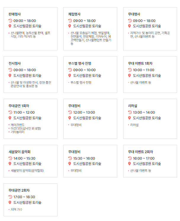 - 무대행사 : 지역 예술인 및 동아리 공연, 산나물 이벤트, 각종 무대공연 및 행사