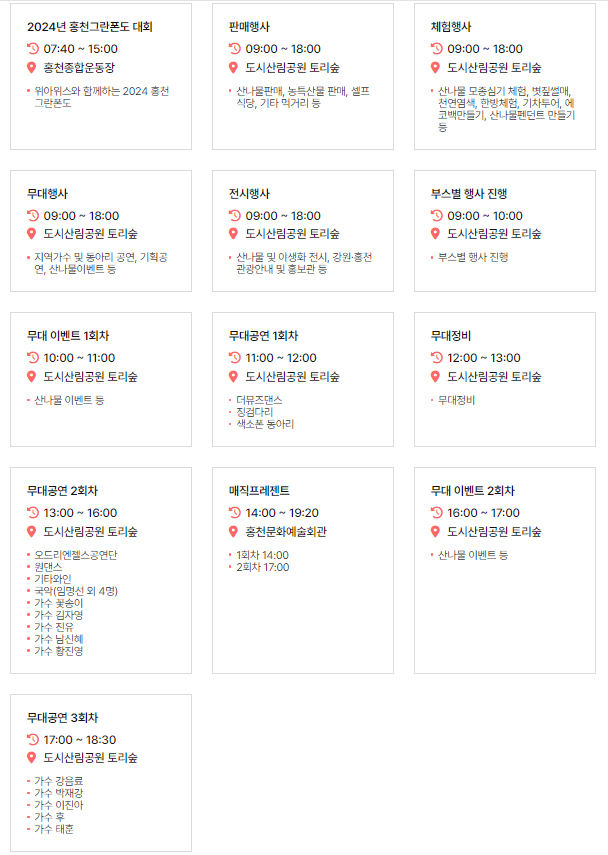 - 홍보행사 : 강원·홍천 관광안내, 산나물 및 야생화 전시관, 홍보관 등