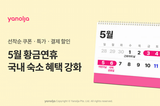 국내외 호텔, 펜션/풀빌라와 레저/액티비티, 항공권을 예약할 수 있는 야놀자에서는 5월 황금연휴를 맞이하여 국내 숙소 행사를 진행합니다.