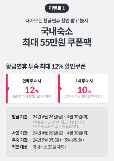 혜택 1 황금연휴 투숙 최대 12% 할인쿠폰