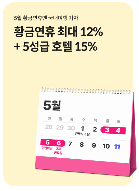 근로자의 날(5/1)부터 어린이날 대체공휴일인 5/6일에 이르는 황금연휴기간에 국내여행 혜택을 강화했다고 하는데요.