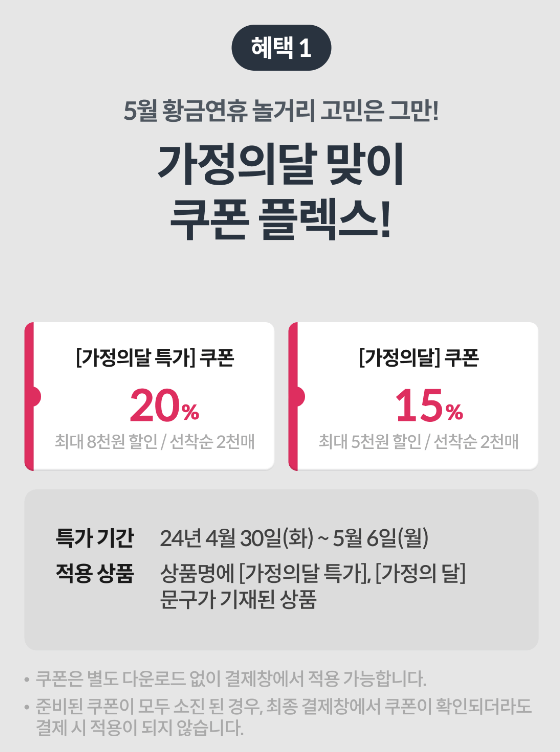 - 적용상품: 상품명에 [가정의 달 특가], [가정의 달] 문구가 기재된 상품