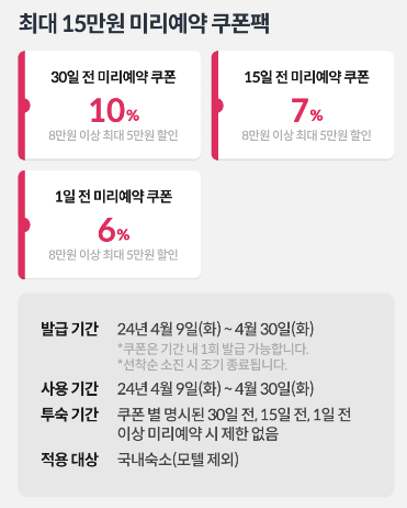 - 투숙시간: 쿠폰 별 명시된 30일 전, 15일 전, 1일 전 이상 미리예약 시 제한 없음