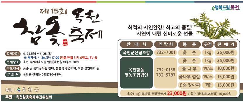 올해 옥천 참옥축제 기간은 4월 26일부터 28일로 옥천상계 체육공원 일원에서 개최될 예정입니다.