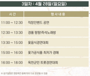 옥천 참옻축제 3일 차에서는 직장인밴드 공연과 옻음식 경연대회, 옻가공식품 최저가 경매, 옥천군민 트롯경연대회가 이어집니다.